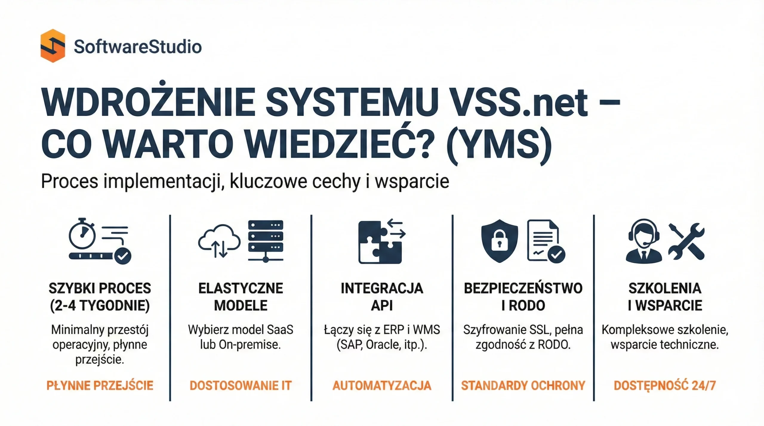 Wdrożenie systemu awizacyjnego VSS.net trwa 2-4 tygodnie bez przestojów w magazynie. Dowiedz się, jak wybrać model deploymentu, zintegrować z ERP/WMS i przygotować zespół do efektywnej pracy z pierwszego dnia.