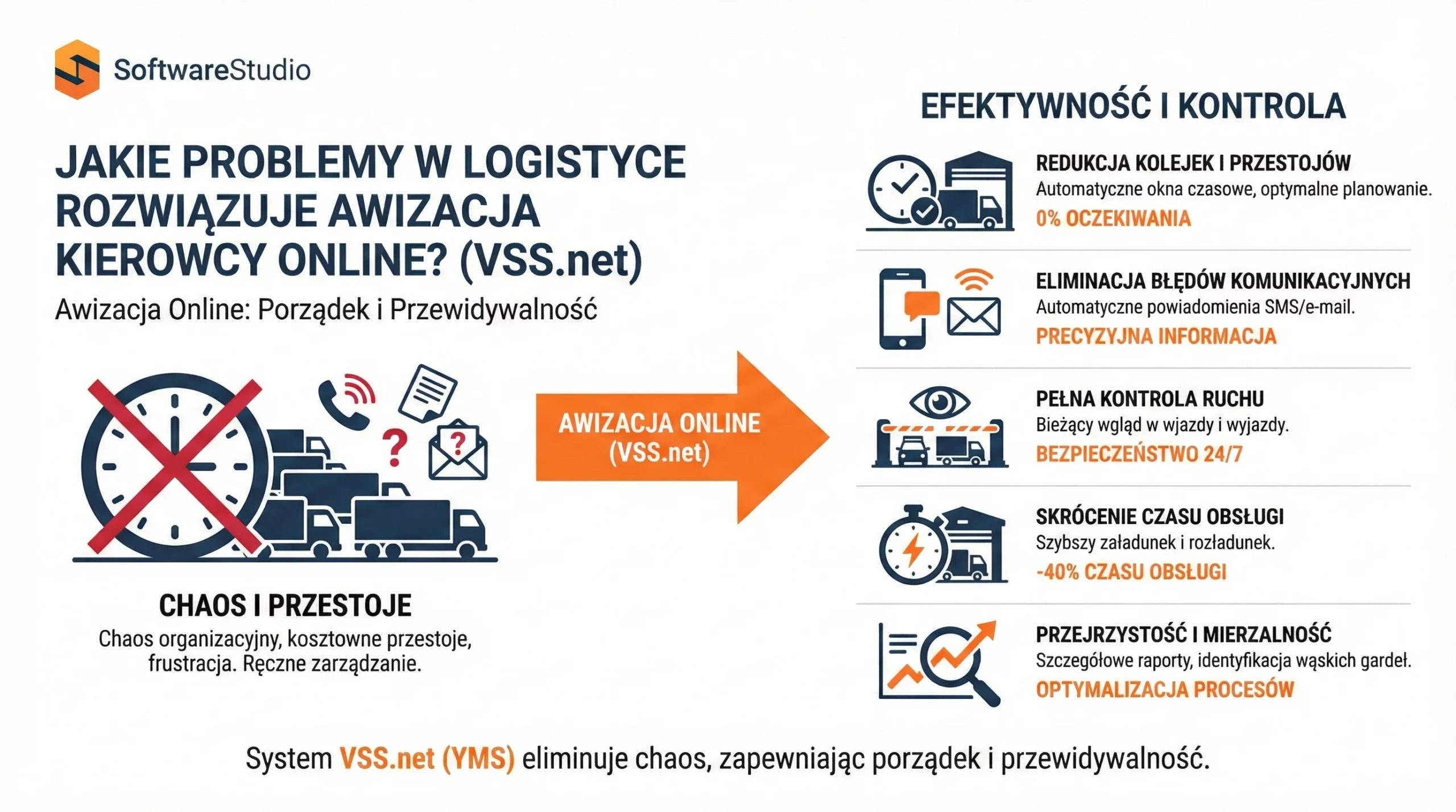 Studio VSS.net to system, który automatyzuje zarządzanie ruchem pojazdów, eliminując wąskie gardła i zapewniając pełną kontrolę nad oknami czasowymi oraz zasobami magazynowymi w czasie rzeczywistym.